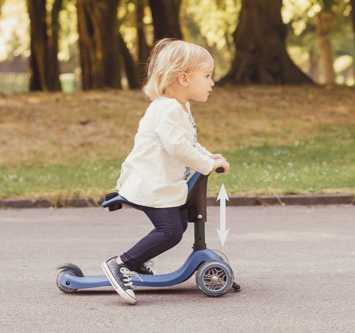 All GO•UP kids scooters with seat are with an adjustable, soft TPR seat to find the most comfortable height for your child in ride-on and walking bike mode. Our GO•UP toddler scooter seats differ in shape and size across our models, to find the perfect fit for your little one.