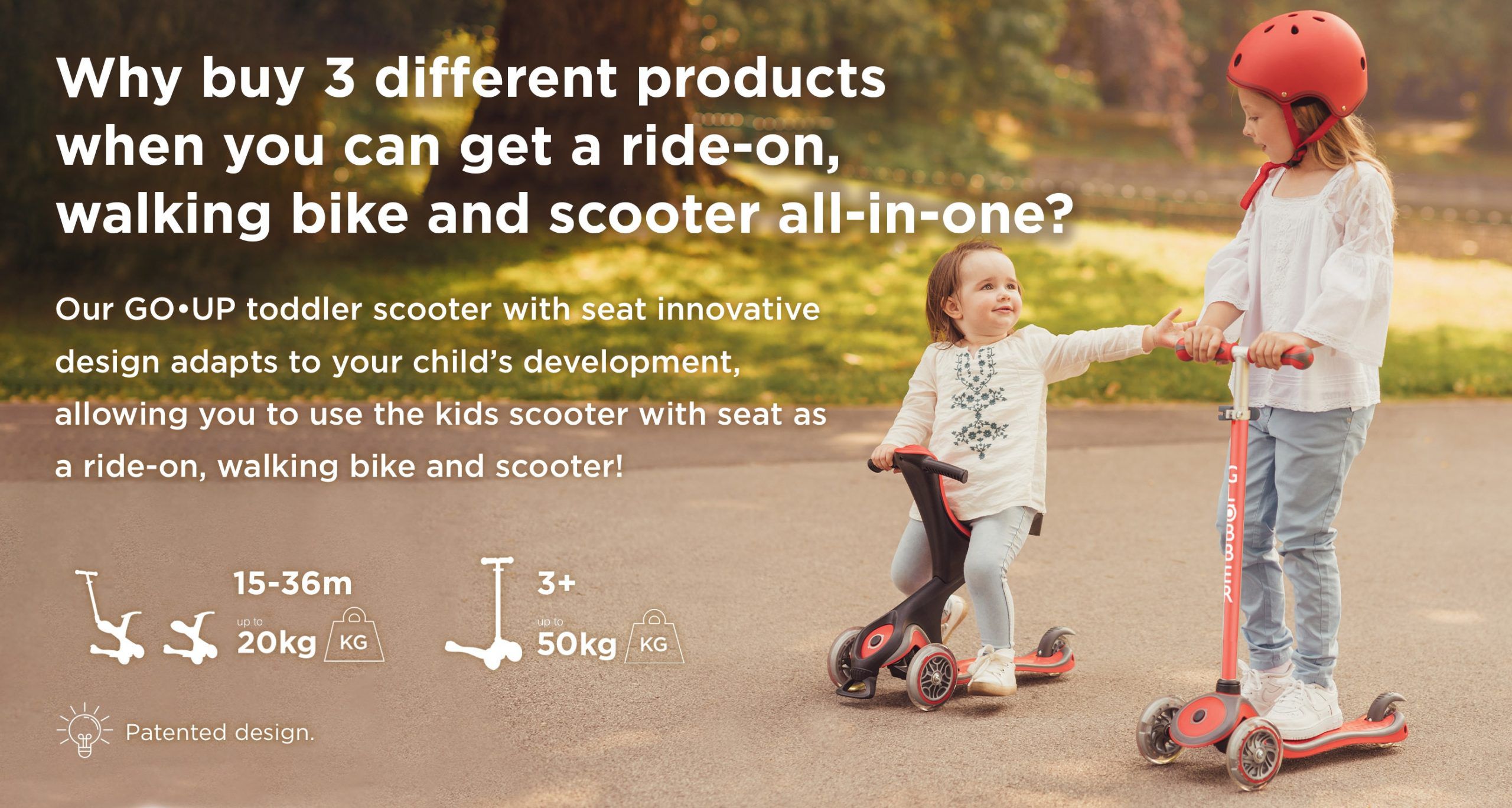 Watch the film to find out how our GO•UP toddler scooter with seat transforms from a ride-on to walking bike & scooter for toddlers aged 15m+!